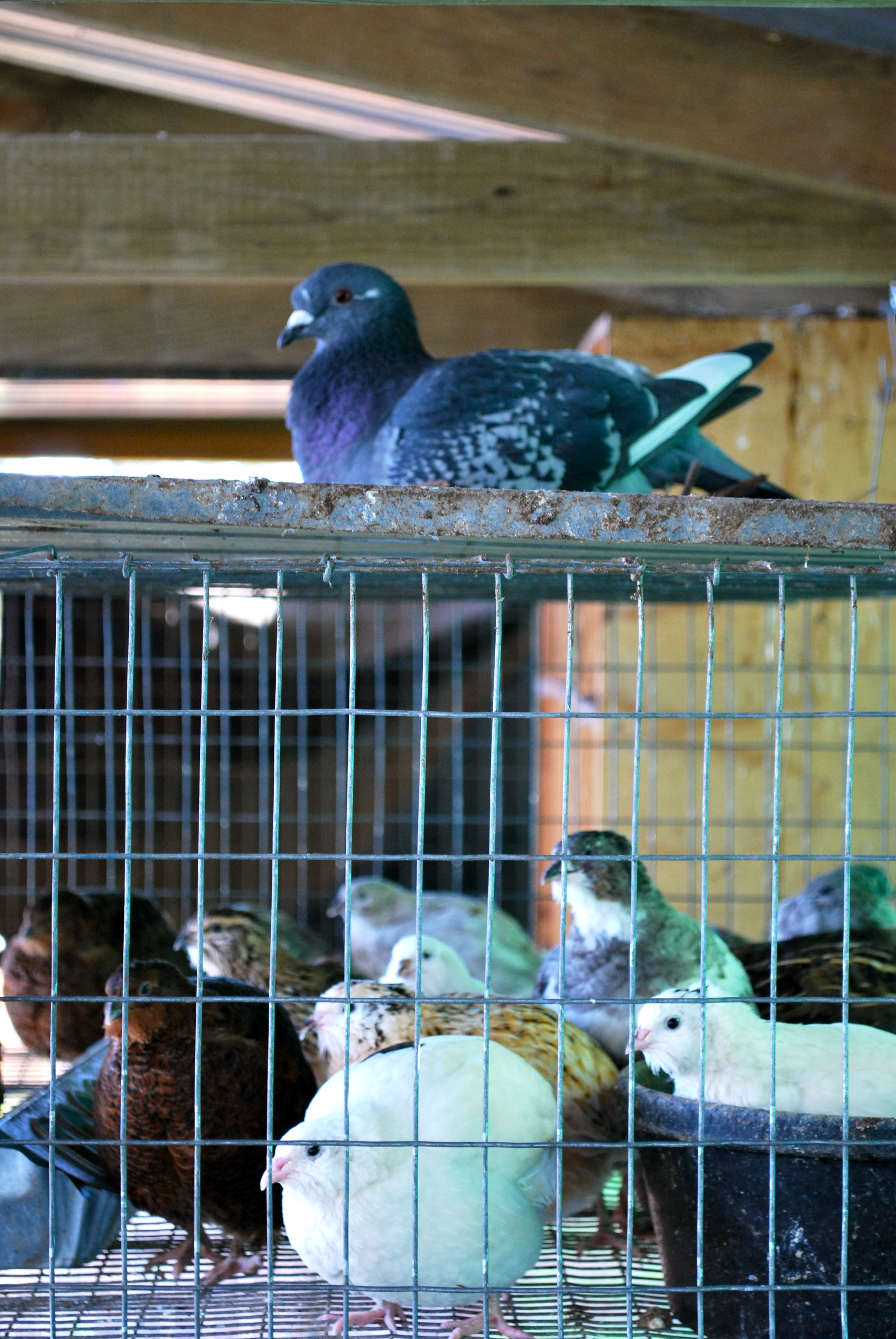 The pigeons are now trying to nest in any spot they can. This hen decided a nice location would be right on top of a piece of metal on the quail cage. I also have a pair taking up a third of my chicken nest boxes. The hen on top of the quail is actually one of the first homers I got, and is one of my favorites because of her little white eye stripe.