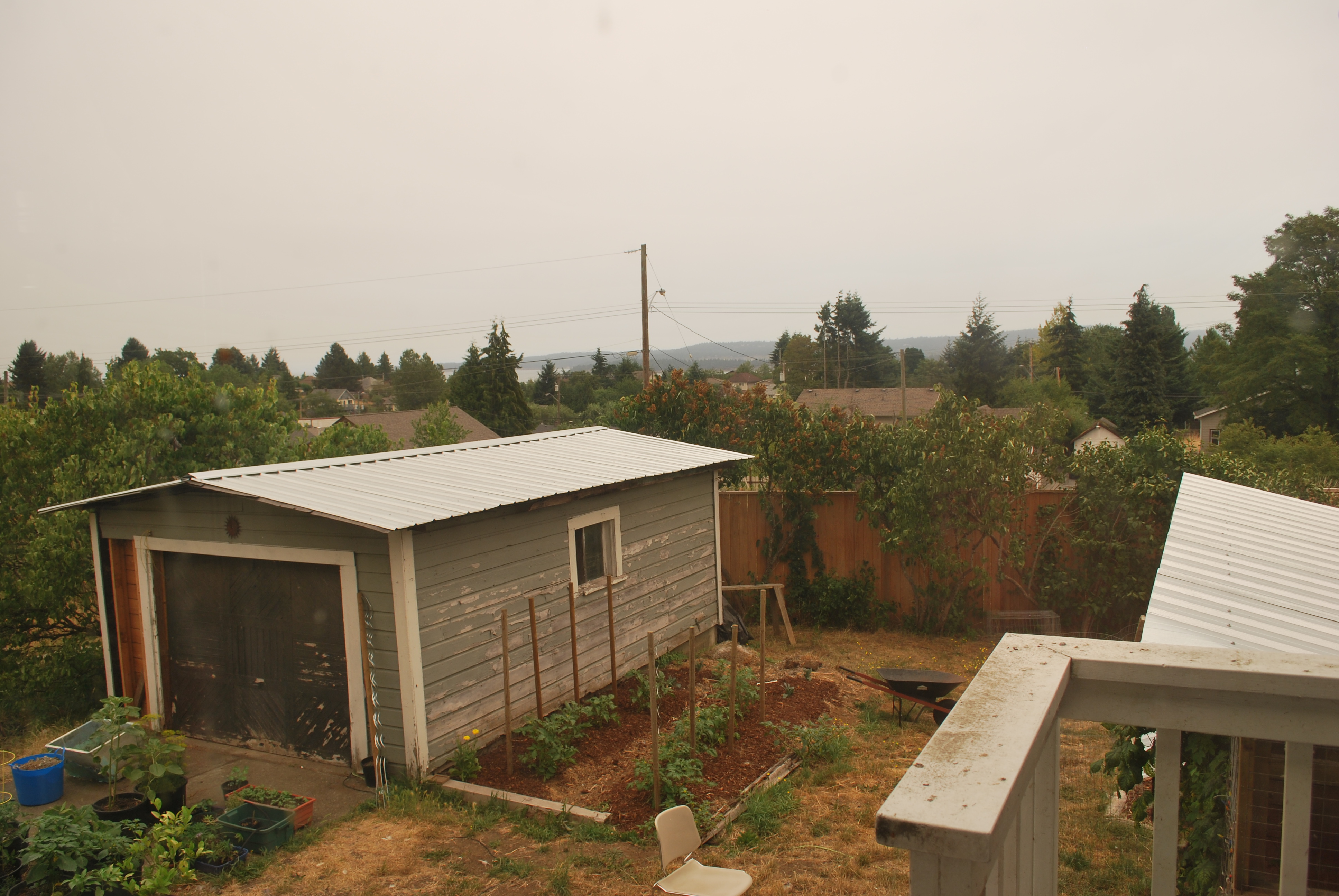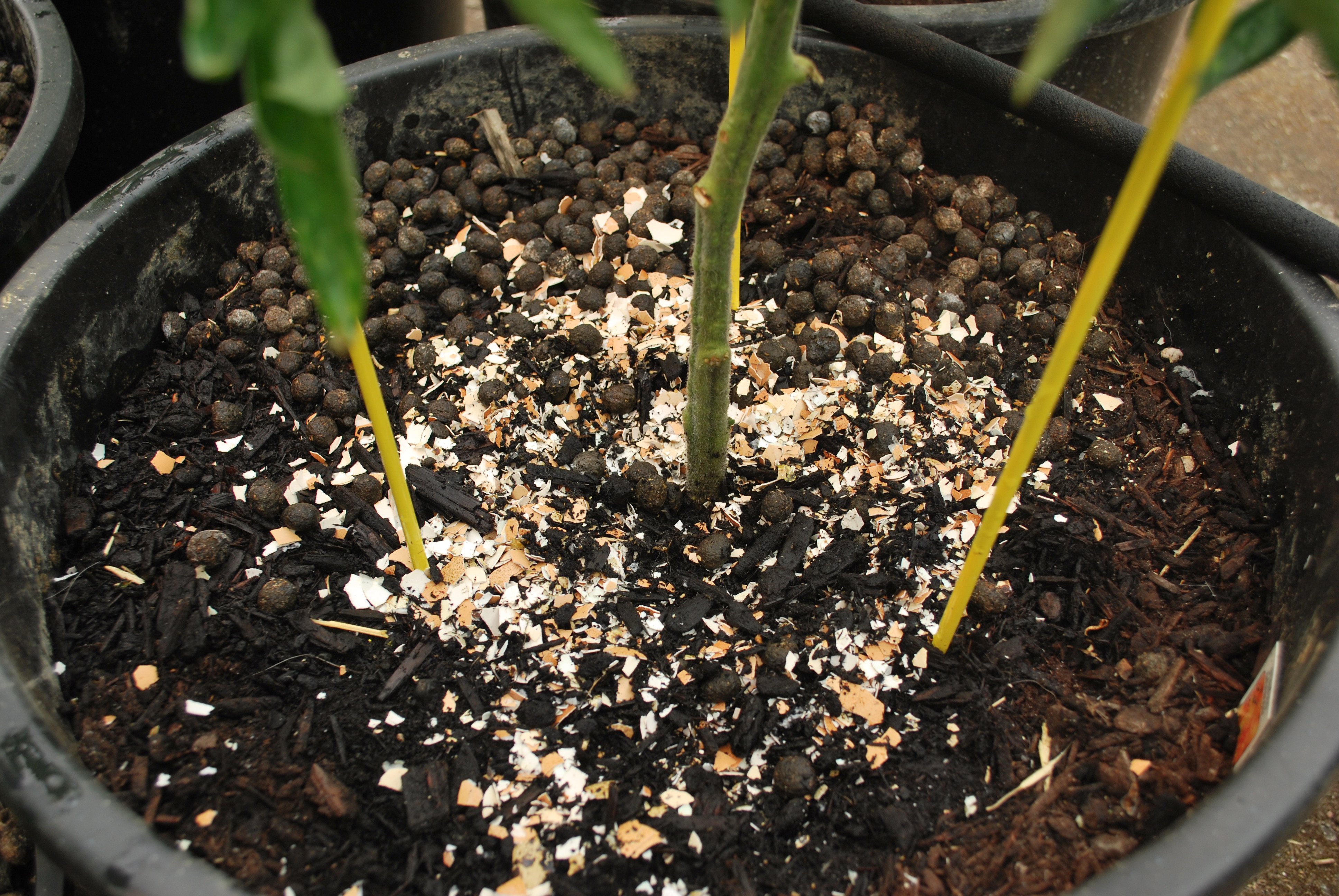 The one plant that I bought at the farmer’s market, my German Striped tomato, has not been doing as well. First I noticed some yellowing lower leaves and then I noticed the blossoms were turning brown and falling off. Then healthy leaves started curling inwards. What the heck? I dosed it today with a handful of crushed eggshells and epsom salt water to see if that will help. I do hope I get some tomatoes from it this year, if only so I can save some seeds and try again.