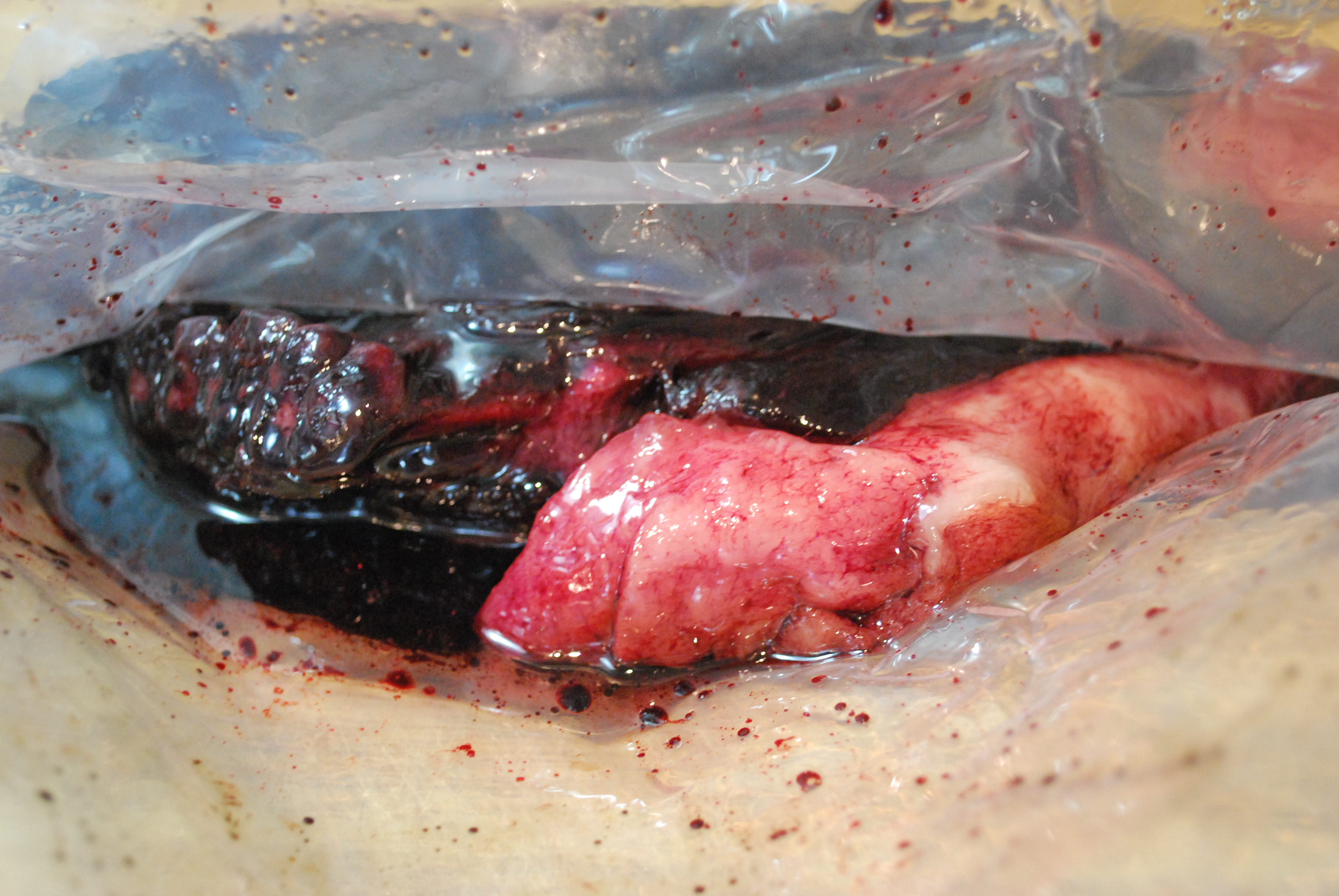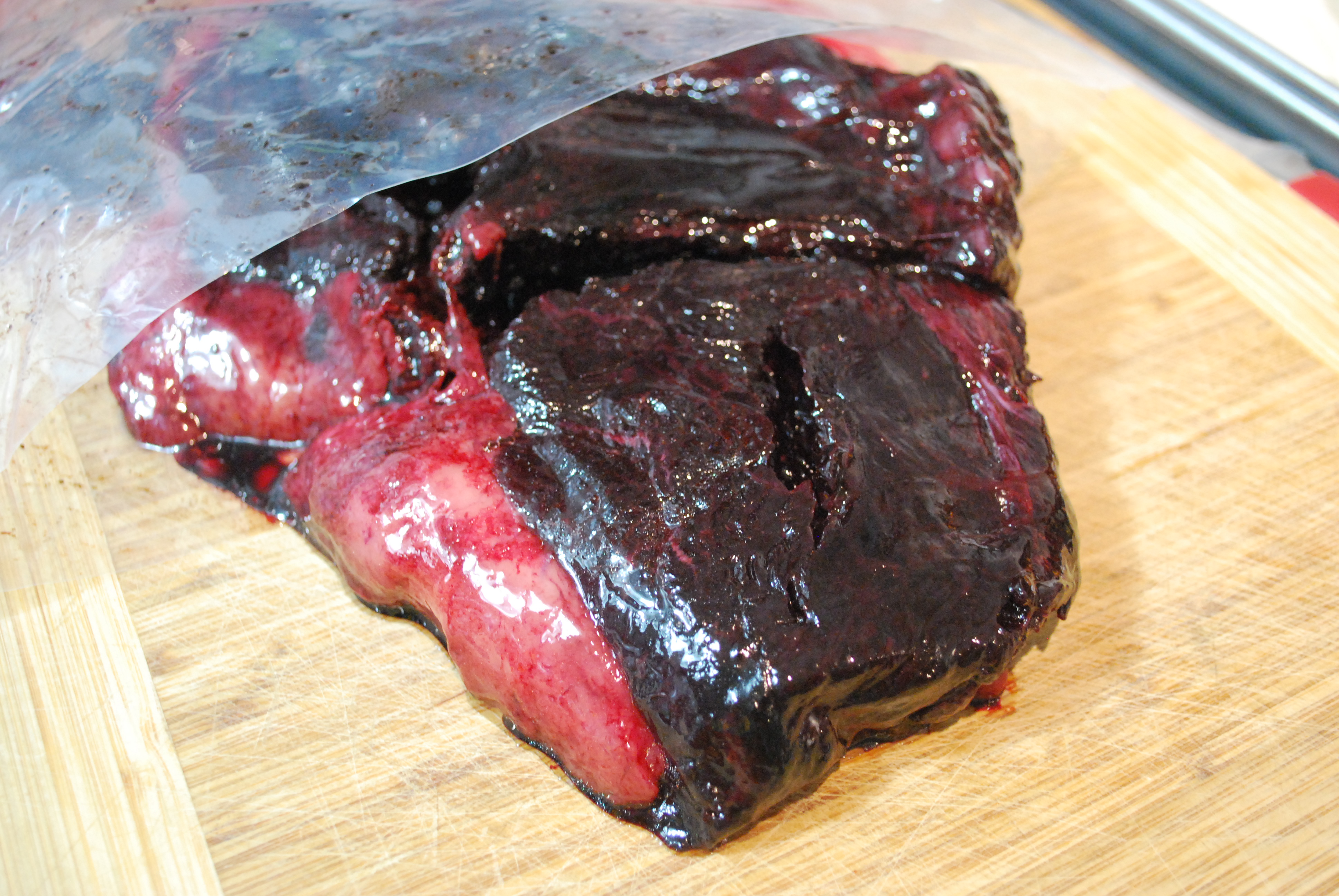 Looking at the frozen slab, I could see light areas as well as very dark, almost black sections. Upon defrosting, I could see that the light areas were a thick layer of fat covering one side, while the dark areas were the meat itself. I also noticed that there was a section of ribs included, a lot of blood and a watery-thin oil slick sitting on top of everything.