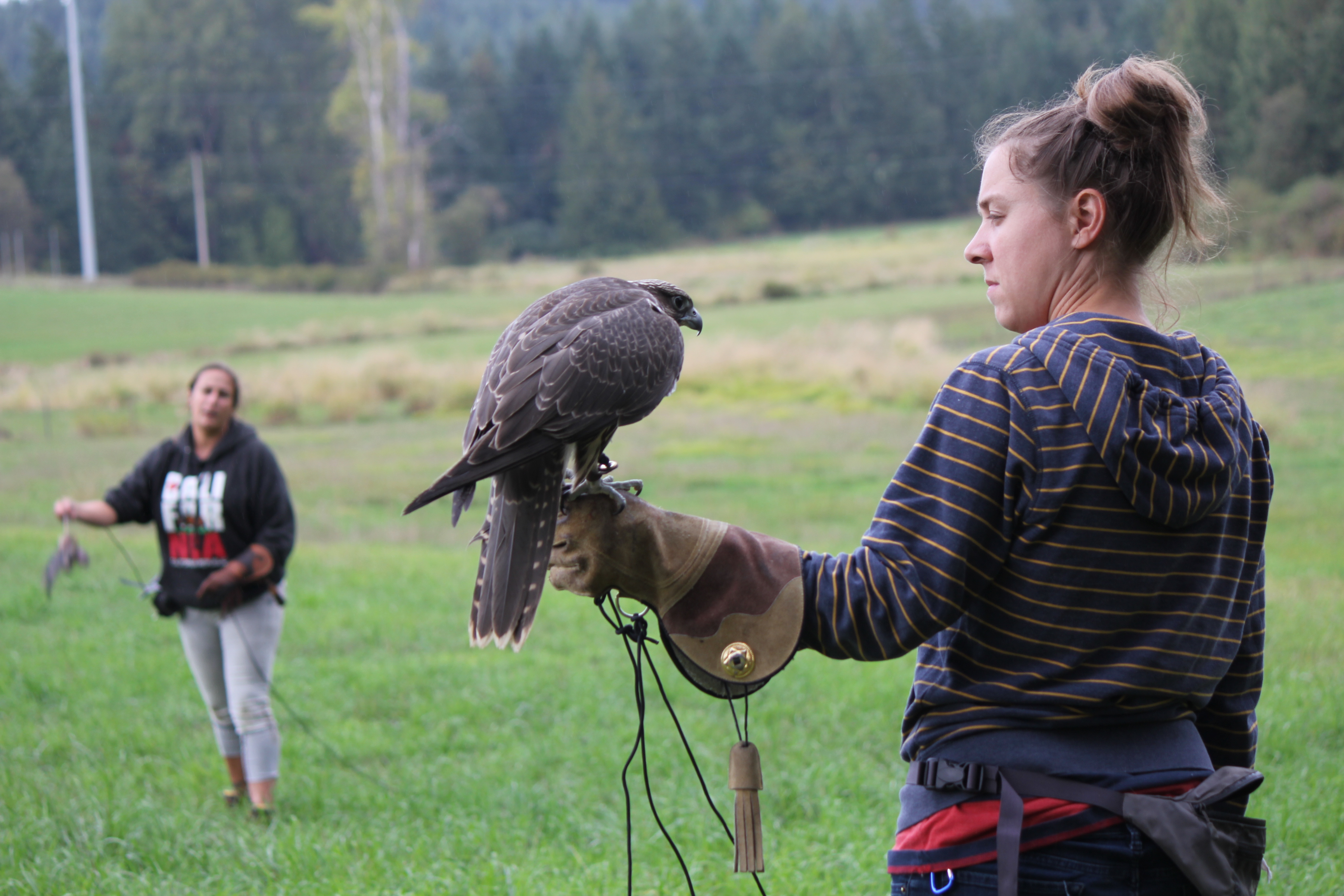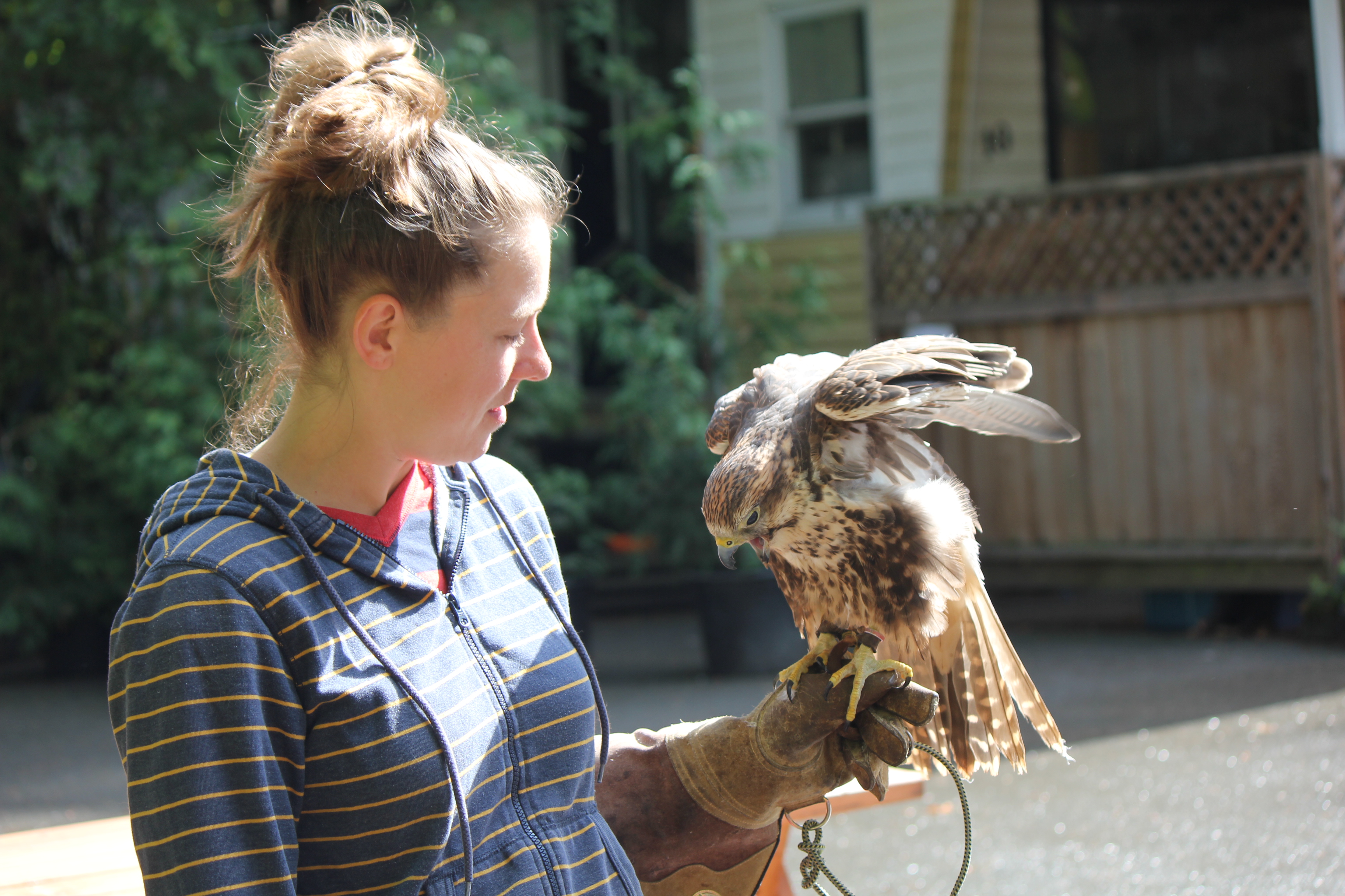 I’ve been working at the Raptor Centre for about a month now and it’s been magical. I’m lucky to be there at a time when there are many young birds to train: Cooper’s Hawks, Red Tailed Hawks, Harris Hawks, Peregrine Falcons, Gyrfalcons and Gyr/Saker Falcon hybrids. They all need glove training and flight training.