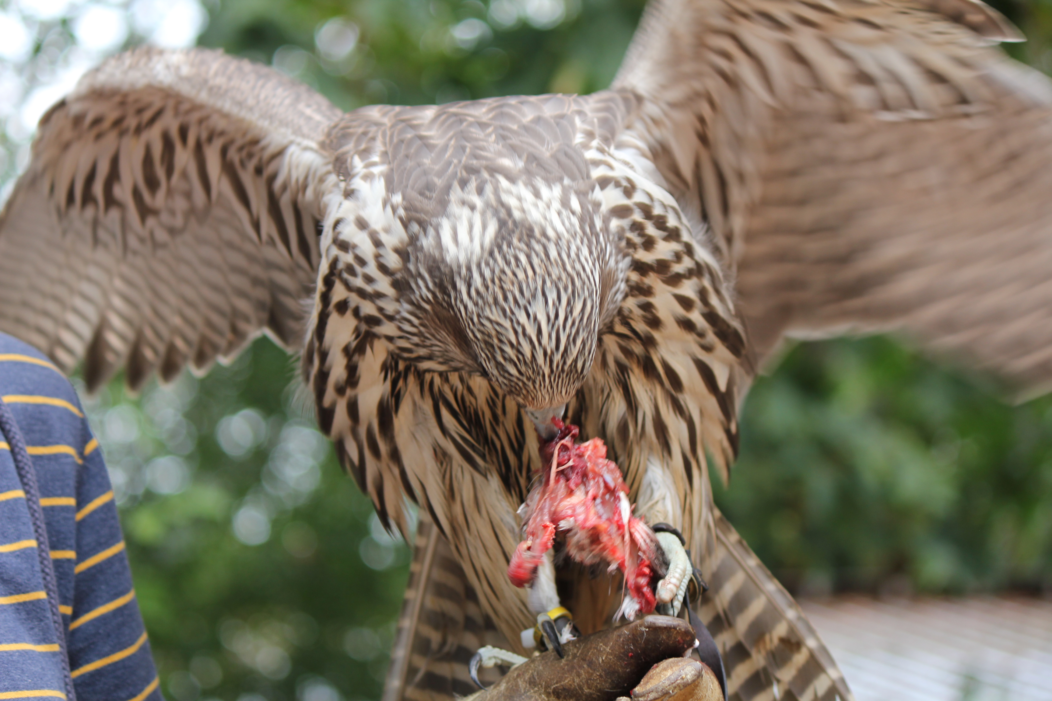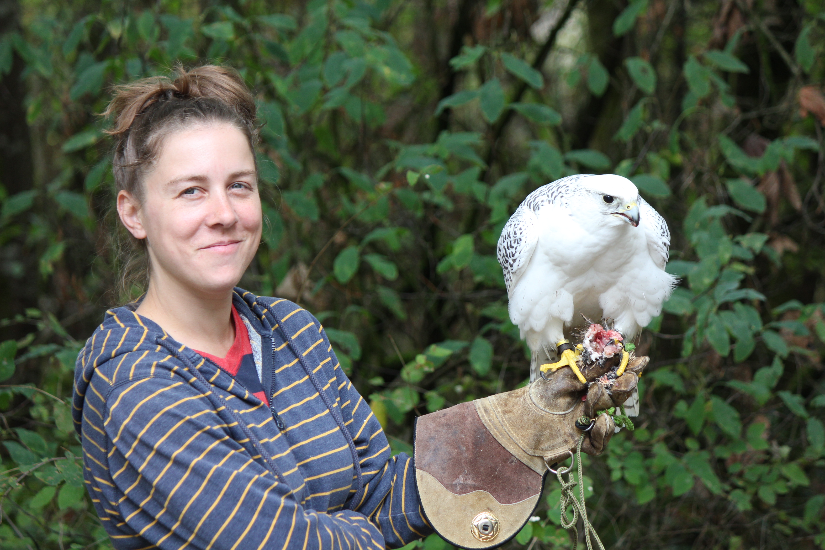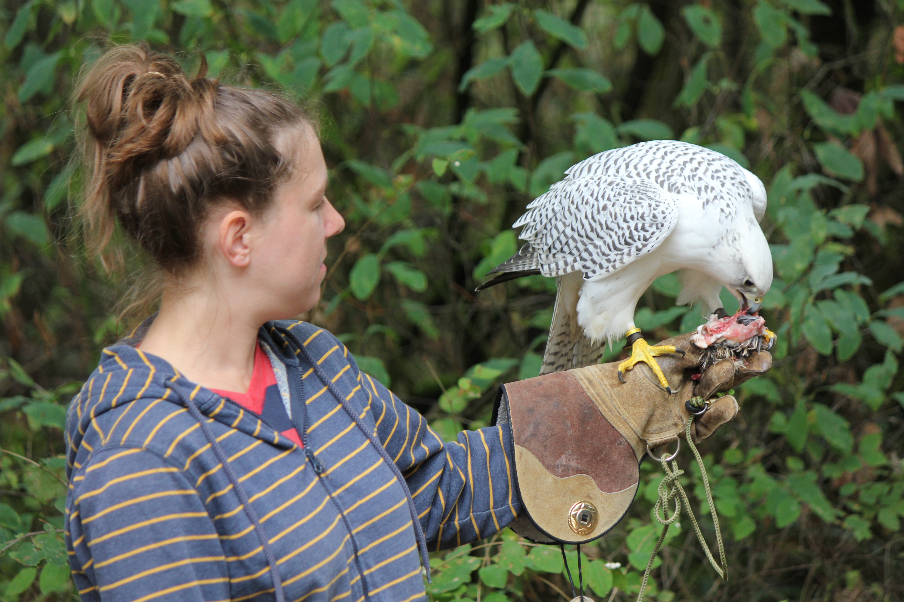 IMG_9402IMG_9398IMG_9383Finally, feeding a pure white Gyrfalcon on the glove. Gyrs are magnificent birds that used to be reserved for kings and nobles in European falconry. They are very impressive, especially when tearing apart their prey. Thanks for reading!