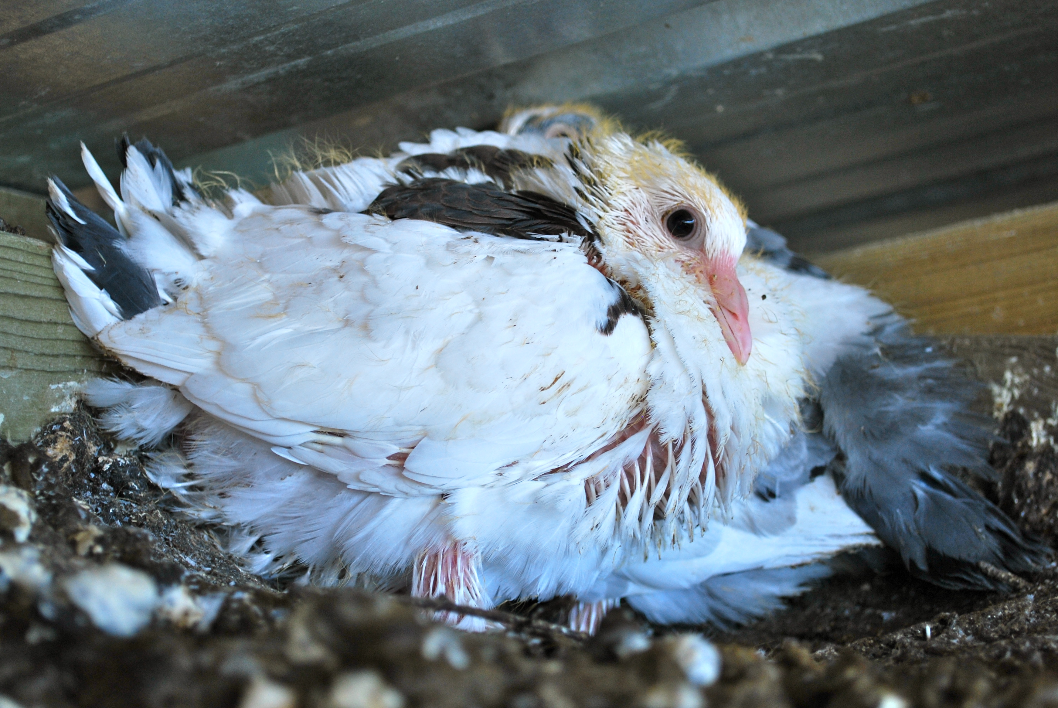 Here are the first pair of pure white squabs to be born here, they’re about 4-5 days old now. Aren’t they cute? I like that they look like they’re smiling.
