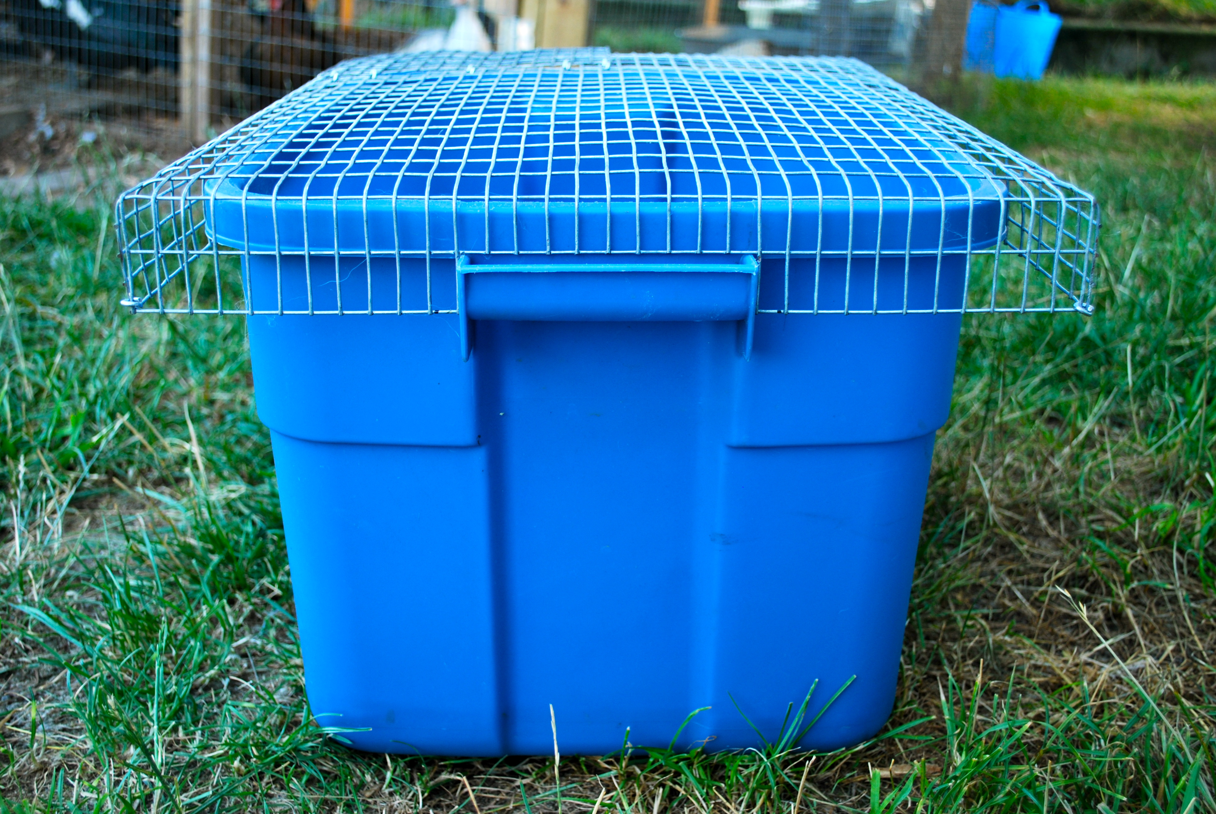 You start with a standard Rubbermaid bin, the one foot tall size works best. Remove the lid and store it. This gives you a nice solid-walled brooder that will protect the tiny chicks from drafts which can chill them. If you decide at some point that raising chicks is really not for you, you still have a usable bin.
