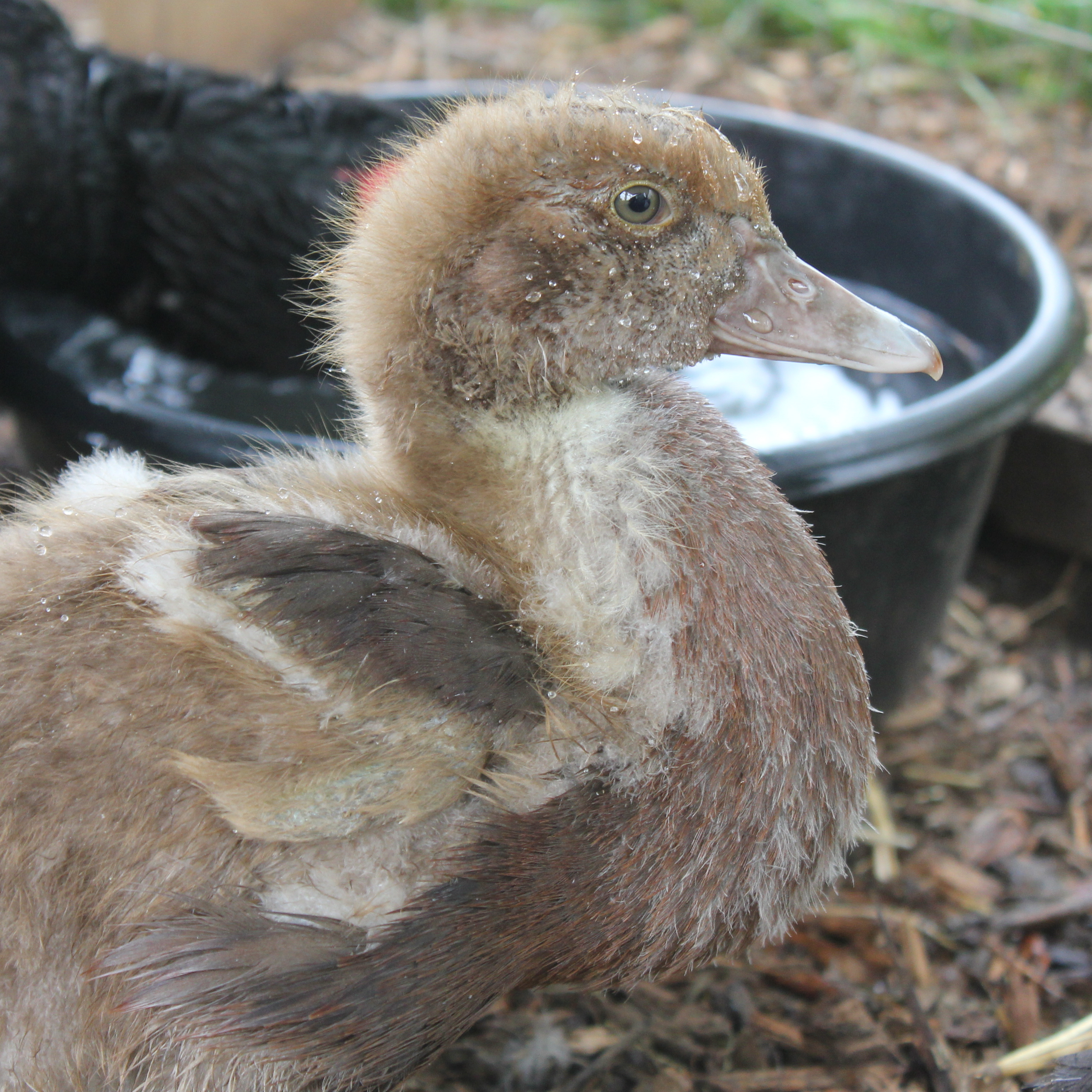 The second purchase was a pair of chocolate Muscovy ducklings. I know, the last thing I need is more ducklings but I really want the chocolate color, so hopefully they will stay on as breeders. The other, older ducklings will probably all be going to freezer camp at the 12 week mark, around the beginning of August.